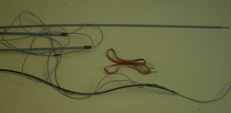 um den Glasfibermast/Angelrute/Stock, an die Masse des Koaxkabels 2 Drähte mit je 2,6 m